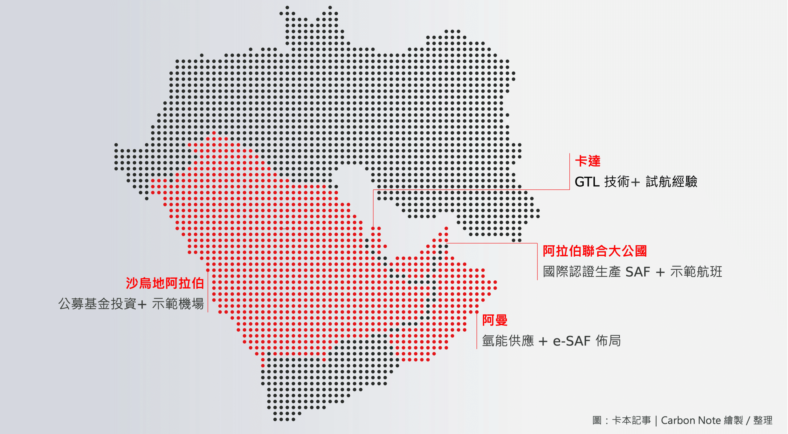 中東地區長期在全球能源供應鏈中扮演關鍵角色,本文將聚焦阿拉伯聯合大公國(UAE)、沙烏地阿拉伯(KSA)與卡達(Qatar)等主要推動者,並概覽其他中東國家在永續航空燃料(Sustainable Aviation Fuel, SAF)發展的現況。他們正以豐富的能源與資金優勢,從零起步構建 SAF 生產基地與國際供應樞紐,嘗試在全球航空業的綠色轉型浪潮中,從傳統石油輸出國角色轉向低碳燃料與技術輸出的新定位。